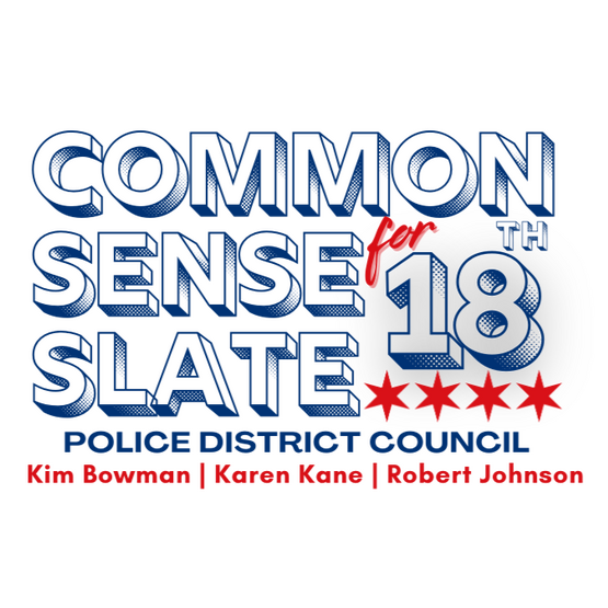 Paid for by Citizens for Kimberly Bowman, Friends of Karen Karen, and Citizens for Robert Johnson. A copy of our report filed with the State Board of Elections is (or will be) available on the Board’s official website (www.elections.il.gov) or for purchase from the State Board of Elections, Springfield, Illinois.The Common Sense Slate for 18th Police District Council
